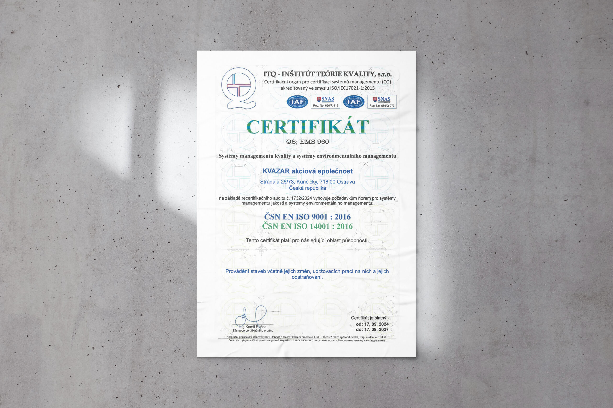 Řídíme se normami ISO 9001, ISO 14001 a ISO 45001, protože víme, že na stavbě nestačí jen zkušenost – důležitá je i odpovědnost.